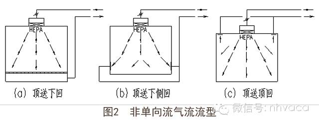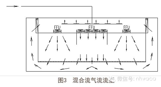 混合流氣流是將垂直單向流和非單向流兩種氣流組合在一起構成的氣流流型。這種氣流的特點是將垂直單向流面積壓縮到最小,用大面積非單向流替代大面積單向流以利節省初投資和運行費。