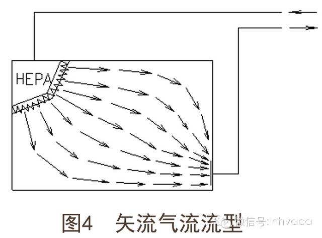 矢流(對角流)潔凈室:選上側圓弧型高效過濾器風口送風,對側下回風口回風的氣流流型。