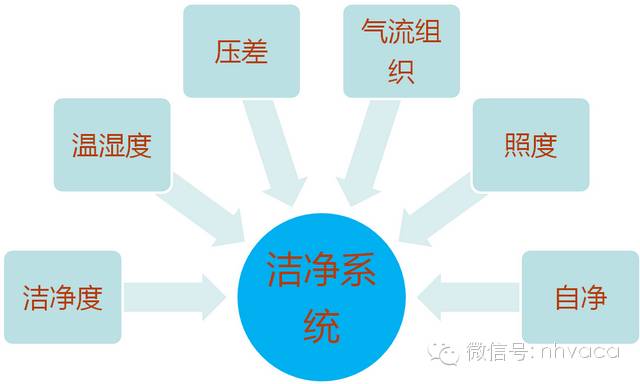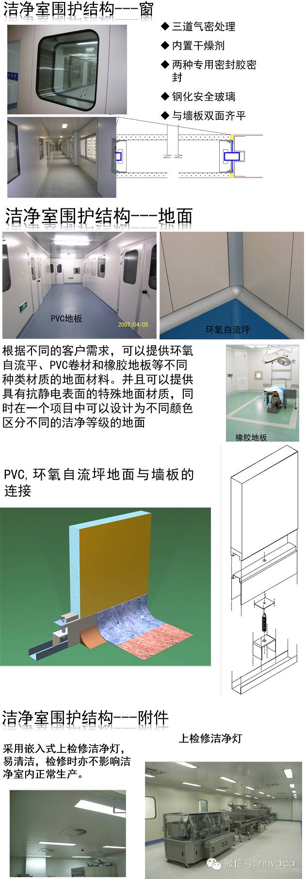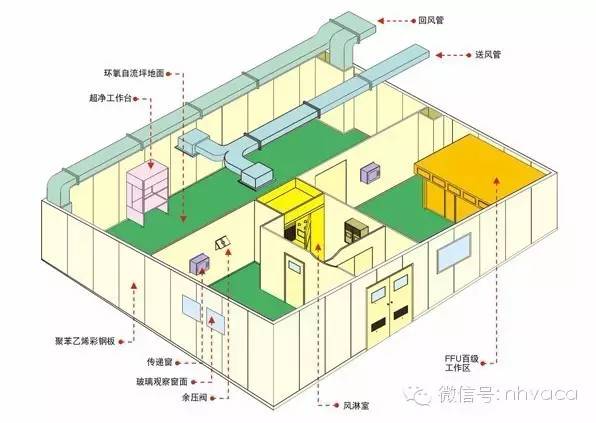 潔凈室的系統構成:大風量的循環空氣(考慮局部排氣)和高性能的過濾器;符合需要的控制溫濕度的空調設備(要考慮內部發熱);設置控制外部塵埃帶入室內的風淋室,傳遞窗等設備。四周不易粘附塵埃,表面光滑,潔凈的房間。