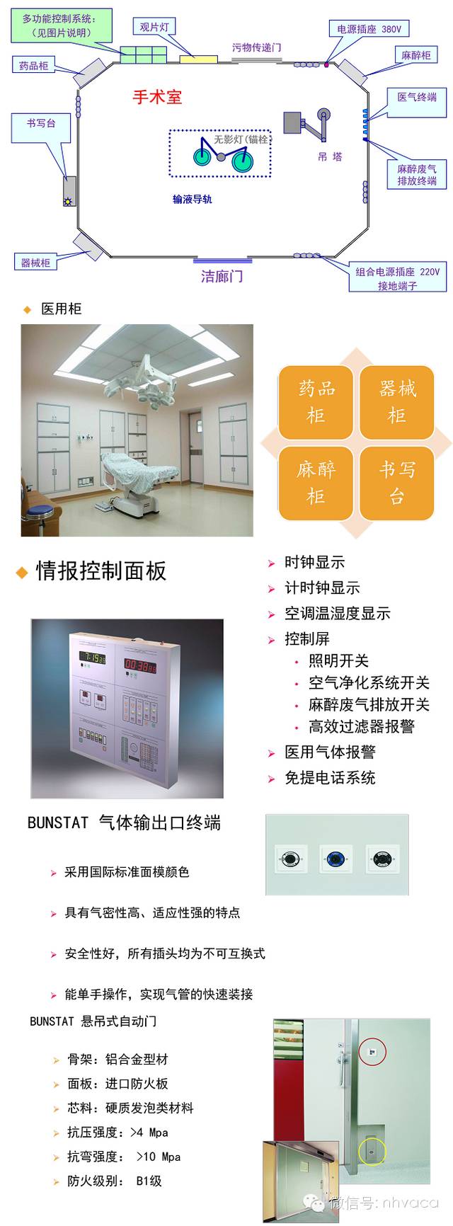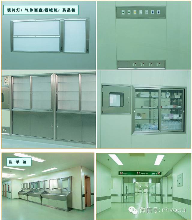 手術室內、藥品柜、器械柜、麻醉柜、書寫臺、X光觀片燈、多功能控制面板、醫用氣體系統、其他裝備、氣密封自動門、洗手池、無影燈、吊塔。