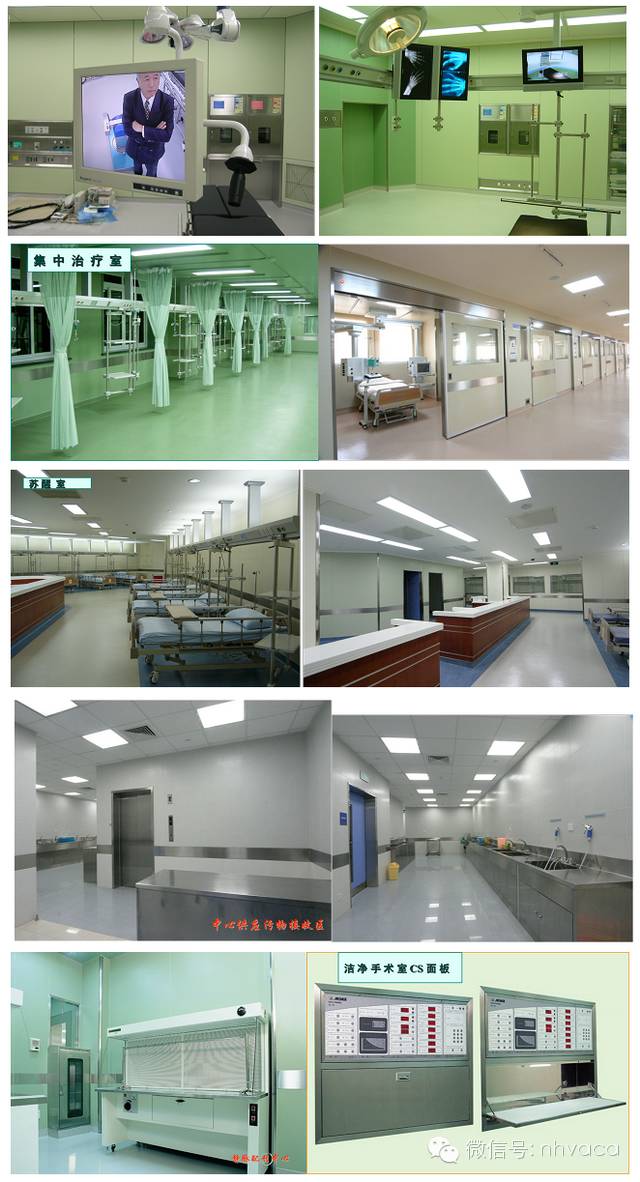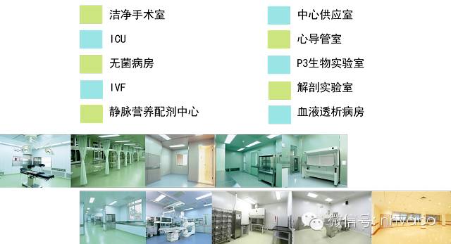 凈化手術部、凈化層流病房、ICU---EICU(急診)、PICU(兒科重癥)、CICU(心臟監護室)、NICU(新生兒監護室)、SICU(外科重癥)、CCU(心內科監護室)、中心供應室、靜脈配置中心、解剖室、IVF(體外受精-胚胎移植)、病理科、檢驗科、制劑室。